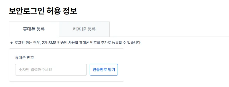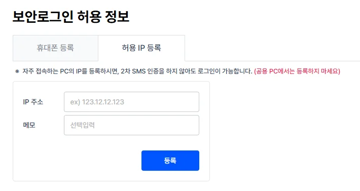 보안로그인 기능을 사용하시면 로그인 시 미리 등록한 IP에서 접속하거나 휴대폰 SMS 추가 인증을 진행하셔야 합니다.