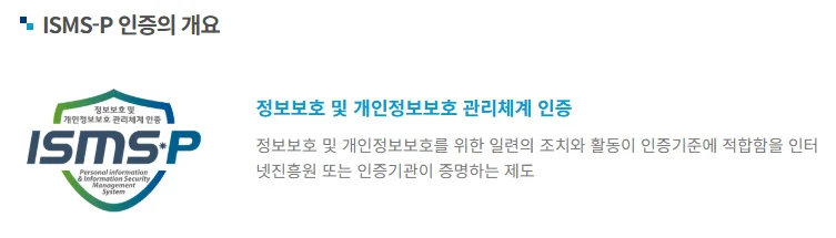 인터넷진흥원에서 해당 기업의 "정보보호 및 개인정보보호"를 위한 일련의 조치와 활동이 인증기준에 적합한지를 점검하고 인증하는 제도 (자세히보기)