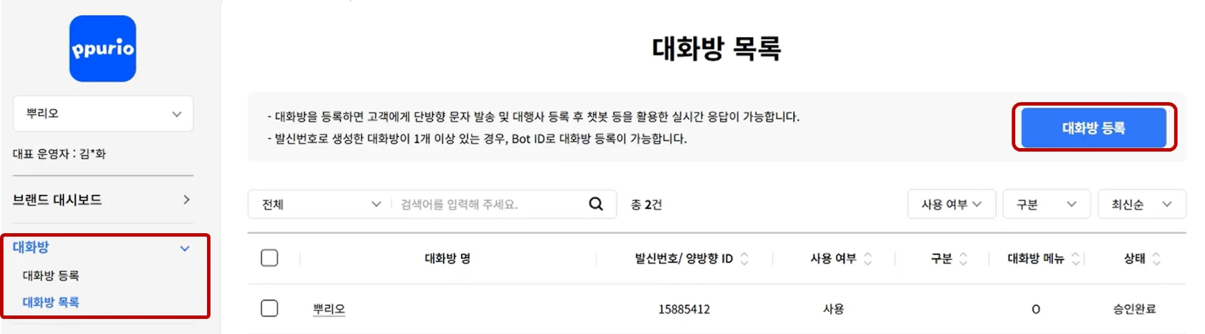 브랜드 심사가 완료되었다면 다음 단계는 '뿌리오 대행사 권한 추가' 입니다.