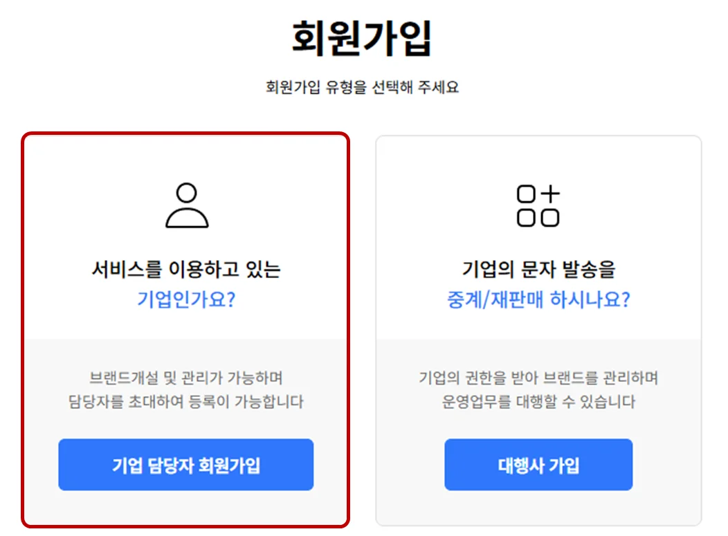 스마트문자(RCS)는 RCS 비즈센터에 가입 후 이용 가능해요. 아래와 같이 가입을 진행해주세요.