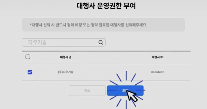 아래와 같이 버튼을 누르면 나오는 검색창에 ['다우기술' 검색 → 대행사 ID 'daoutech' 체크] → 하단의 [초대하기] 버튼을 클릭합니다.