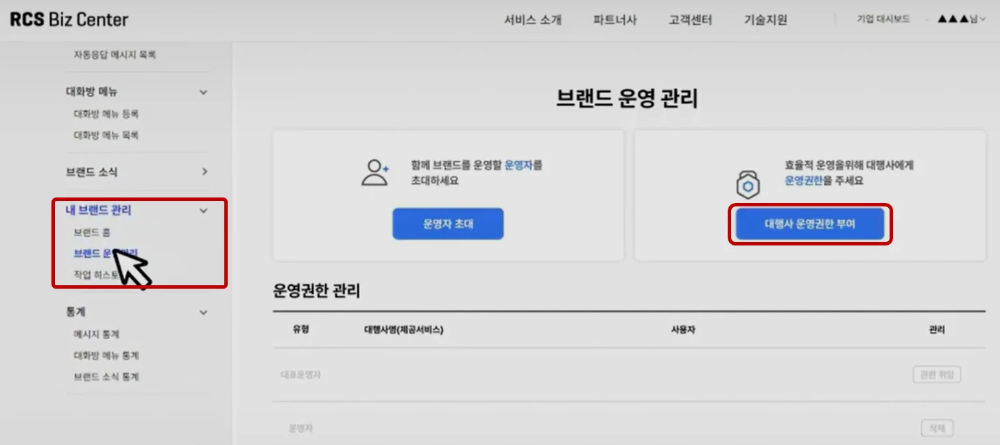 브랜드 대시보드에서 [내 브랜드 관리 > 브랜드 운영관리] 선택 후 우측 [대행사 운영권한 부여]를 클릭합니다.