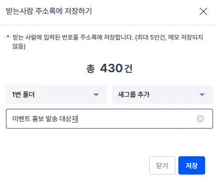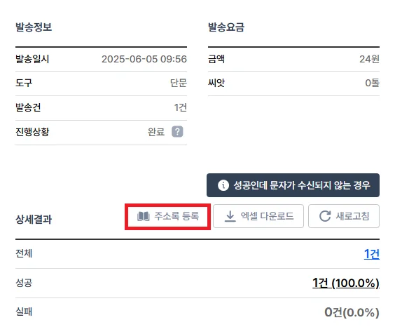 발송결과 페이지에서 [주소록 등록] 기능을 사용해보세요.