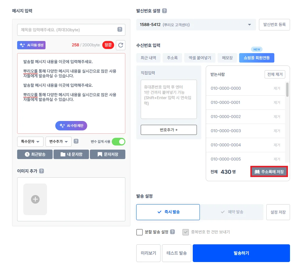 뿌리오 발송화면에서 메시지를 작성 중, 입력된 대상에게 다음에도 메시지를 발송할 것 같다면?