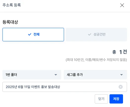 TIP. 전체 대상은 물론, 성공건만 분류하여 주소록으로 간단하게 저장하실 수 있습니다.