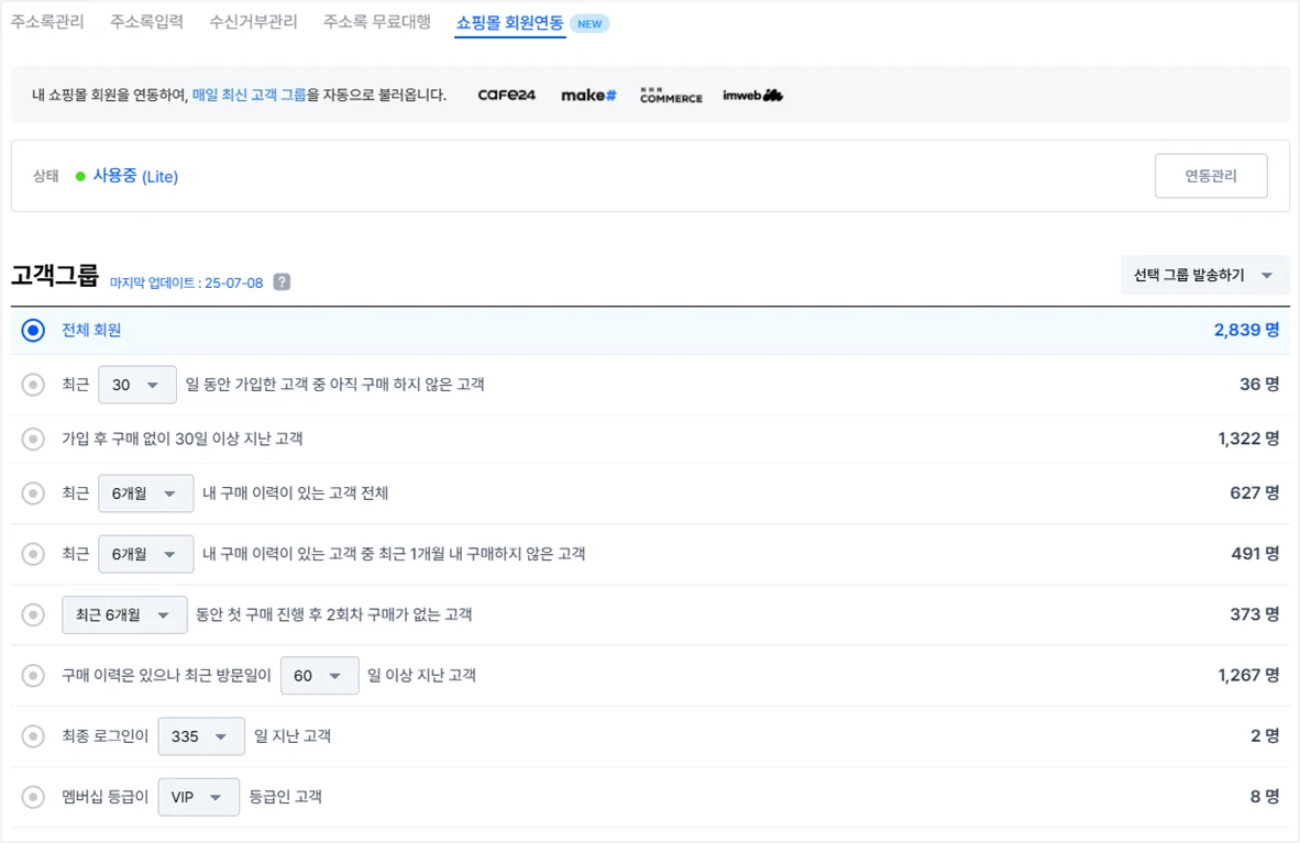 연동 과정도 매우 간단했고 한번 연동하니 별도의 작업 없이도 구매 이력이나 관심사에 따라 쇼핑몰 회원 정보가 주소록에 자동으로 그룹화되어서 타깃별 메시지를 쉽게 발송할 수 있게 되었죠.