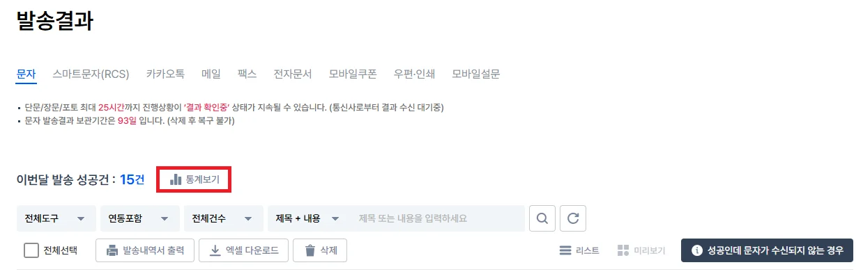 발송결과는 기본적으로 '발송일시' 기준 최신순으로 정렬되는데요,