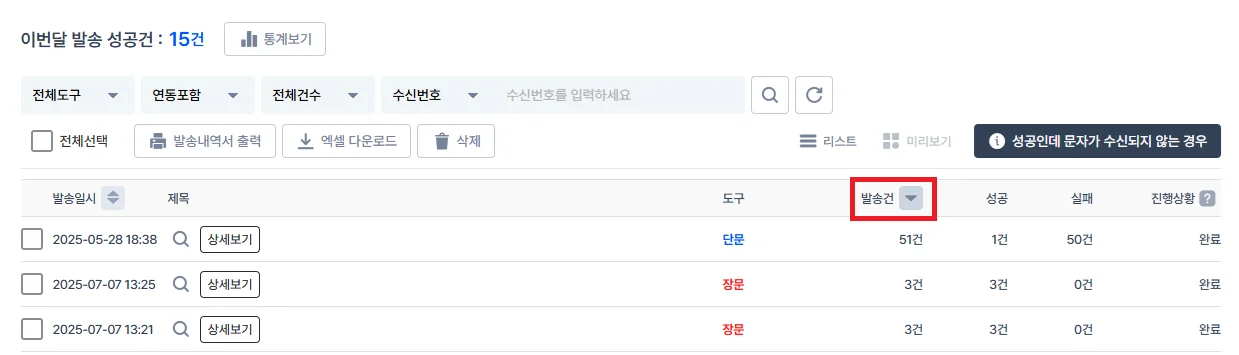발송건 우측의 화살표를 클릭하시면 '발송건수 내림차순' / '오름차순'으로 정렬을 변경하실 수 있습니다.