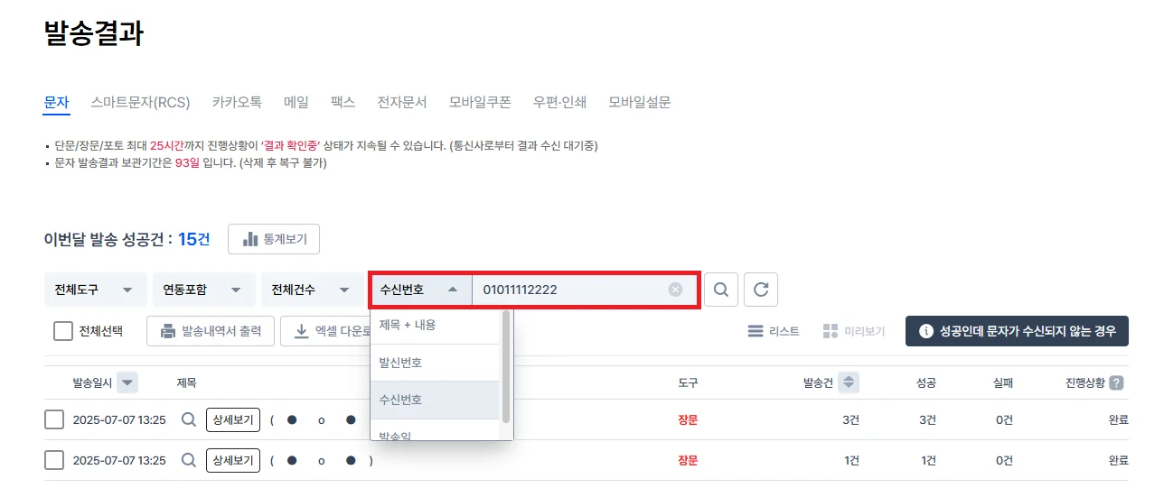 발송결과에서 '수신번호'로 검색을 하면, 입력된 번호가 '받는사람 리스트'에 포함된 발송건만 검색하실 수 있습니다.