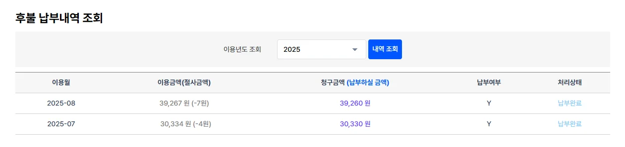 - 후불 계약완료 후 확인 가능한 [충전 > 후불납부내역] 메뉴에서 확인하실 수 있습니다.