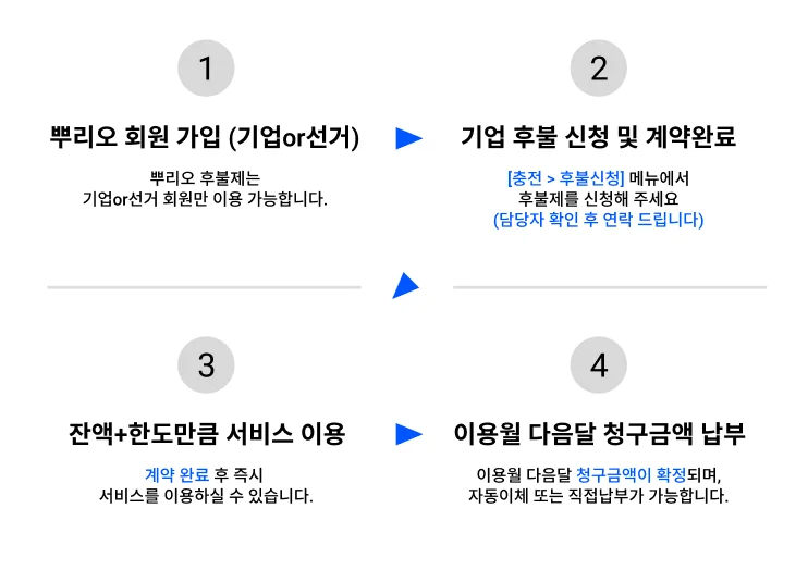 뿌리오는 '기업회원'의 편의를 위해 [기업전용 후불제]를 운영하고 있습니다.