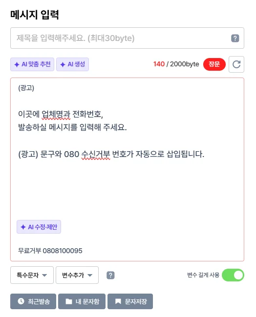 [광고문자] 페이지를 통해 메시지를 발송하시면, (광고) 문구와 080 수신거부 번호가 메시지 앞/뒤에 자동으로 입력됩니다.