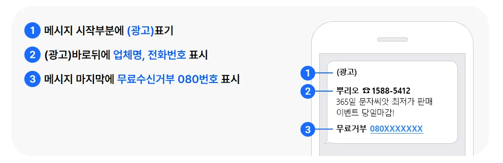 '정보통신망법 제 50조'에 의거하여 (광고) 표기 및 발신자 정보와 수신거부 수단을 반드시 포함하여야 합니다.