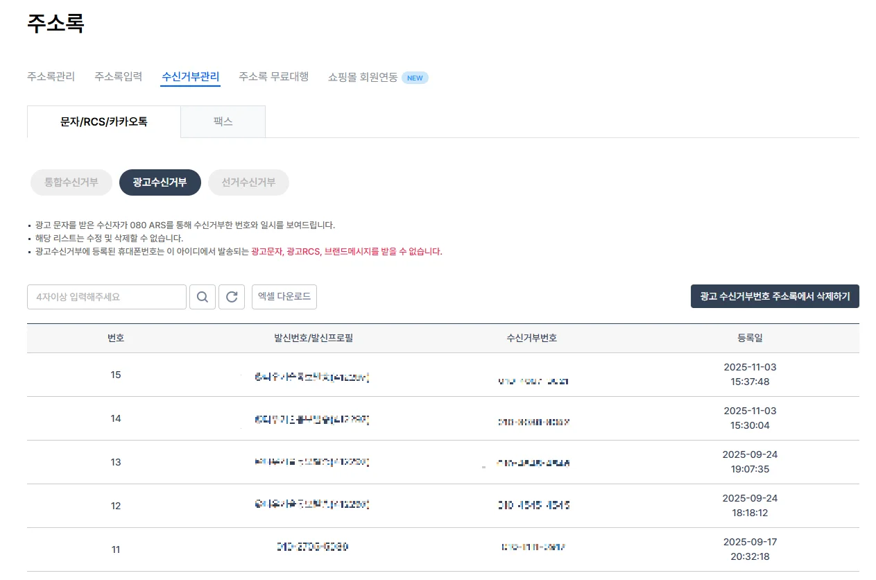 수신거부 리스트는 [주소록 > 수신거부관리] 메뉴의 '광고수신거부' 메뉴에서 확인할 수 있습니다.