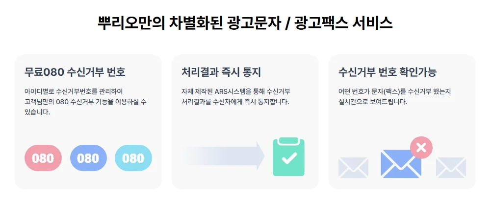 메시지를 받은 수신자가 080 수신거부 번호를 통해 수신거부 의사를 표시한 경우, 수신거부 이후 [광고문자] 메뉴를 통해 발송하는 메시지가 자동으로 '뿌리오 수신거부' 항목으로 차단됩니다.