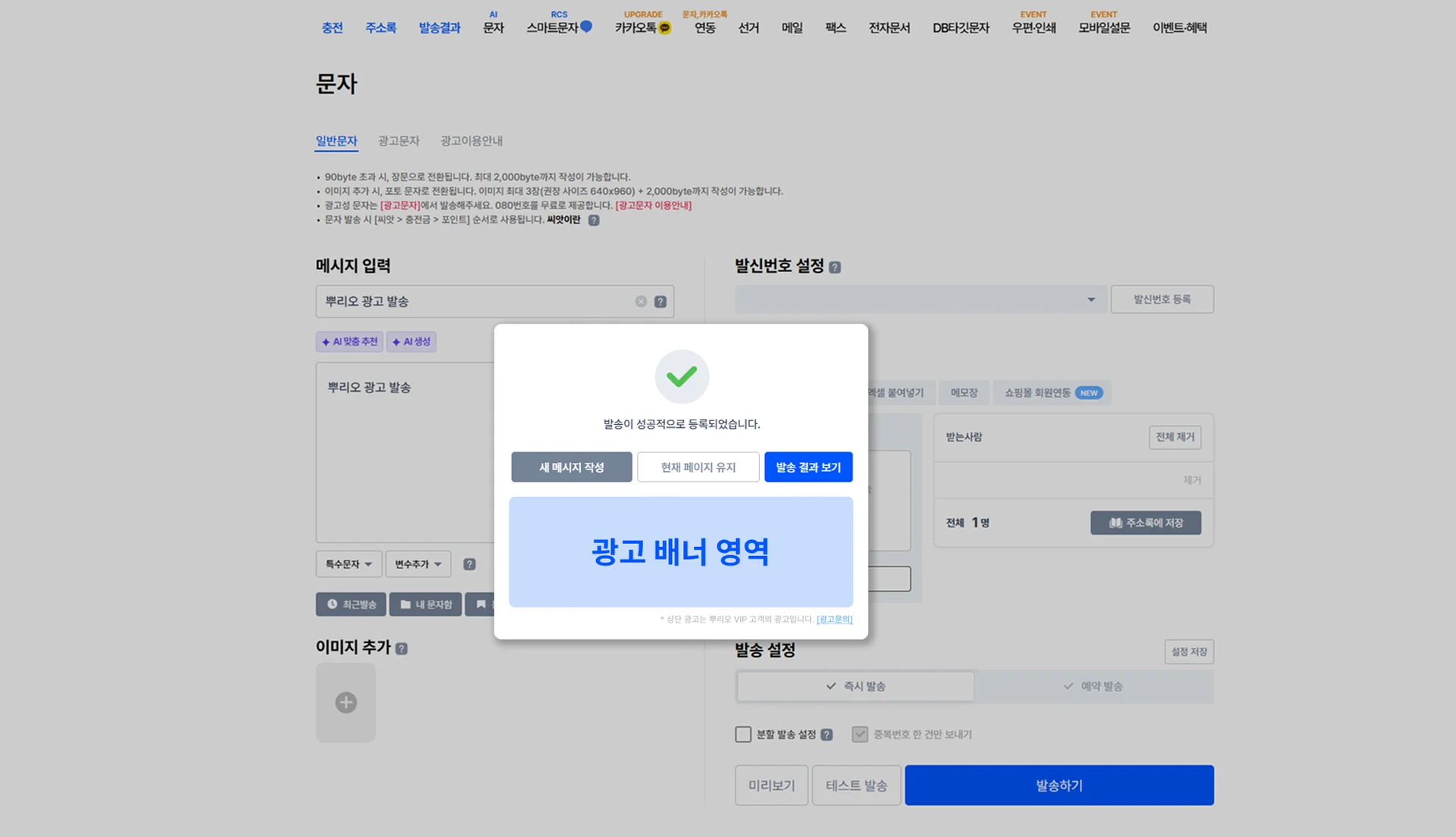 뿌리오 광고 상품은 메시지 발송 완료 팝업에 배너 형태로 게재되기 때문에