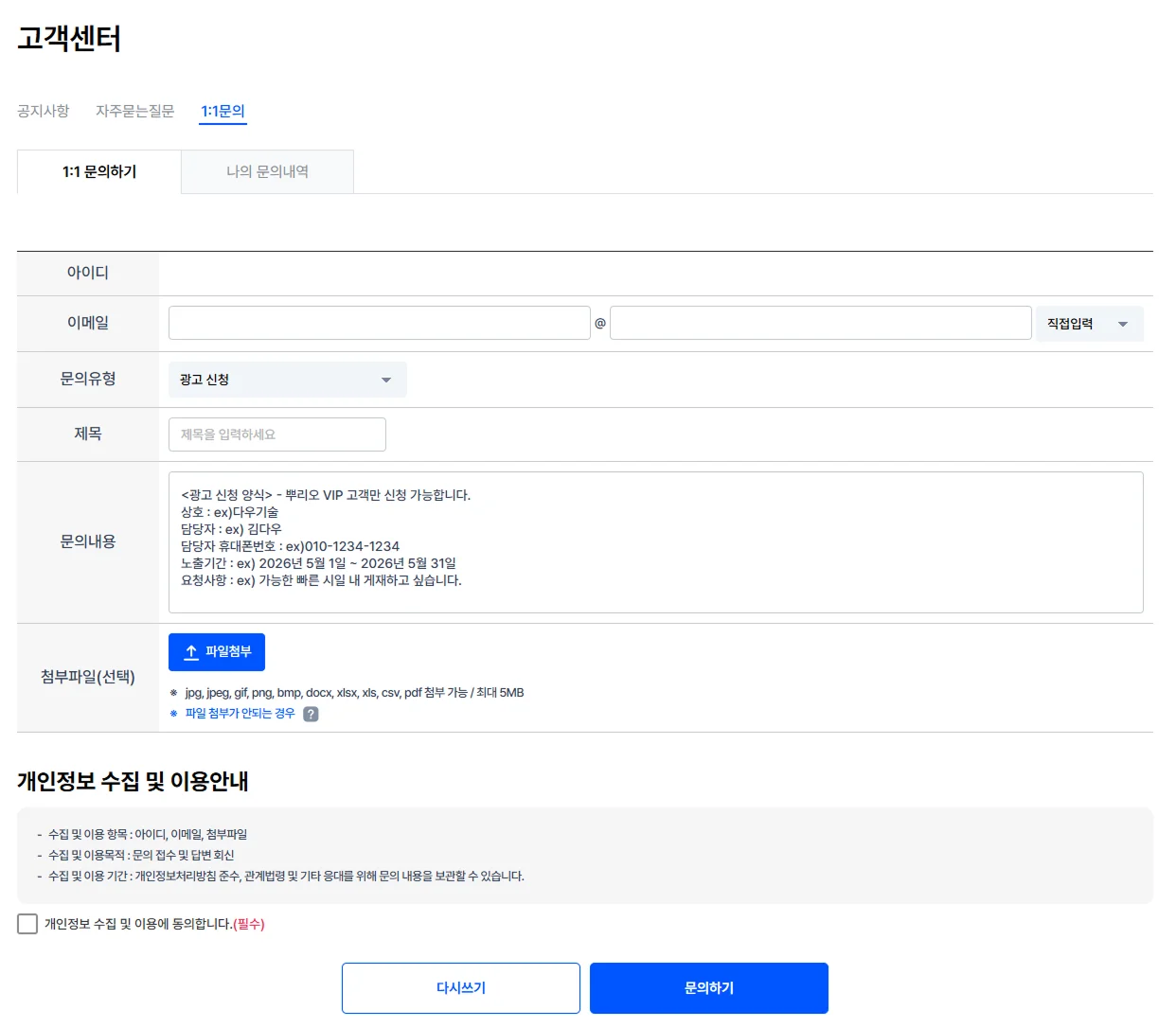 2️⃣ 문의유형 '광고 신청' 선택 > 하단의 신청 양식 작성 후 [문의하기] 버튼 클릭