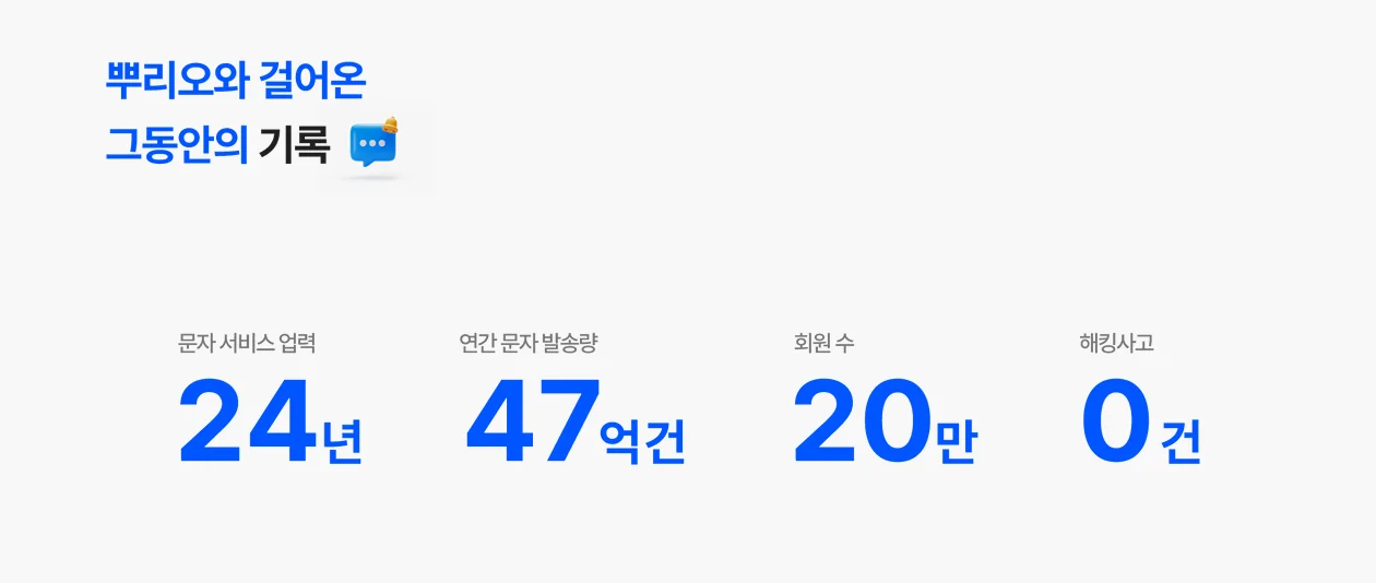 뿌리오는 업계 최초로 ISMS-P 인증 및 개인정보보호 마크를 획득하며 개인정보보호에 대한 신뢰성을 검증 받은 서비스로 24년의 운영기간동안 해킹사고 0건을 자랑하고 있습니다.