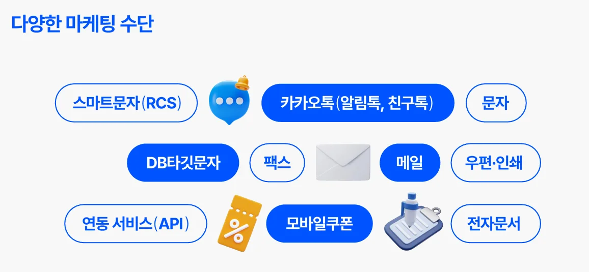 이를 위해 처음 사이트를 선택할 때부터 문자뿐만이 아닌 RCS나 카카오톡, 메일, 팩스 등 비즈니스를 위해 필요한 다양한 마케팅 수단을 보유했는지를 확인할 필요가 있습니다.