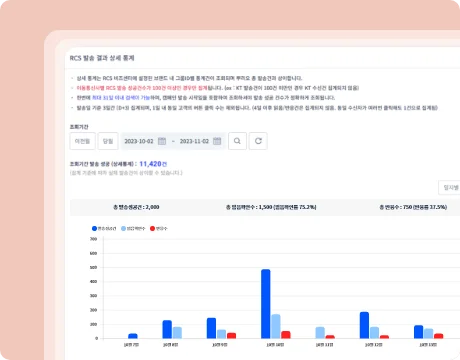 발송 후 메시지 읽음 여부, 버튼 클릭수 등 발송 통계를 확인할 수 있어 메시지 발송 효과를 검증할 수 있습니다. 또한, 수집된 데이터를 통해 더 발전된 마케팅 전략 수립이 가능합니다.