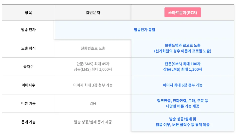 스마트문자(RCS)는 일반문자에 비해 글자수와 이미지 첨부 수를 대폭 늘릴 수 있어 비용을 절감할 수 있습니다. 단문(SMS)은 최대 100자, 장문(LMS)은 최대 1,300자까지 입력 가능하며, 최대 6장의 이미지를 첨부할 수 있습니다.