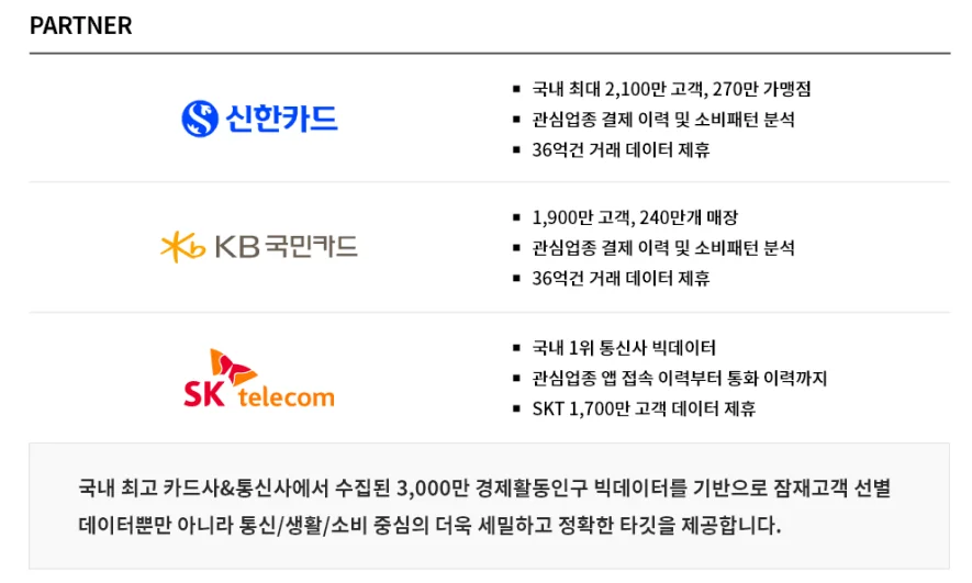DB타깃문자는 신한카드, KB국민카드, SKT와 함께 하는 서비스로 카드사, 통신사 고객의 실제 구매 및 이용 데이터 분석을 통해 분류된 고객 유형 중 내가 원하는 최적의 마케팅 타깃을 선정하여 직접 프로모션 문자를 발송하는 서비스입니다.