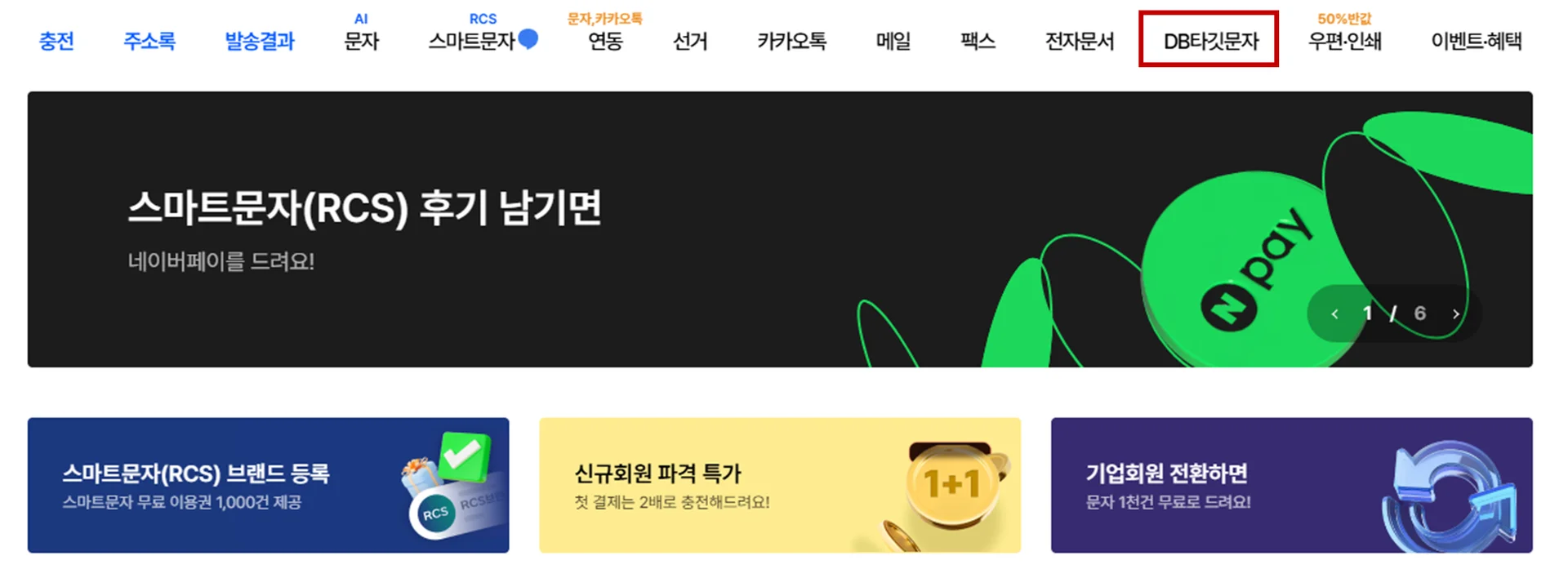(1) 뿌리오 메인 홈페이지 상단에 있는 [DB타깃문자] 메뉴를 클릭합니다. (아래 이미지 참고)