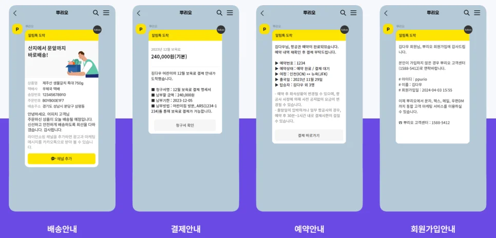 배송안내, 결제안내, 예약안내, 회원가입 안내 등 다양한 고객 관리 시나리오에 맞춰 메시지를 전송할 수 있습니다. 고객이 궁금해하는 정보를 실시간으로 제공하니, 고객 커뮤니케이션 만족도가 더욱 높아지겠죠?