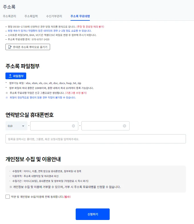 주소록 무료대행 서비스 이용 가이드