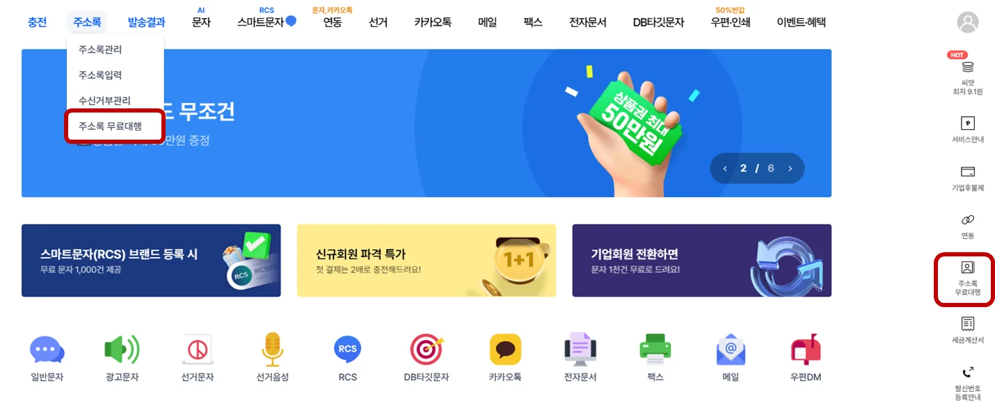 ① 주소록 무료대행 메뉴 클릭