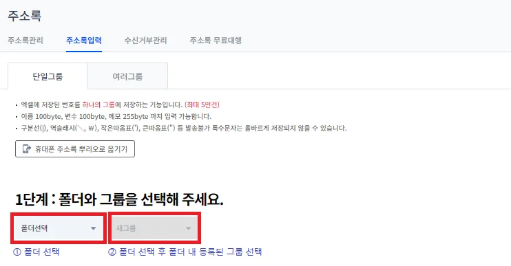주소록 입력 메뉴를 클릭하면 아래와 같은 화면이 나타나는데요, 주소록 입력을 위해서는 [1. 폴더선택] → [2. 폴더 내 등록된 그룹 선택]을 진행해주세요!