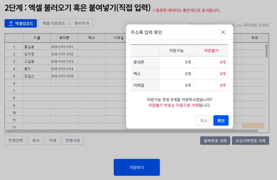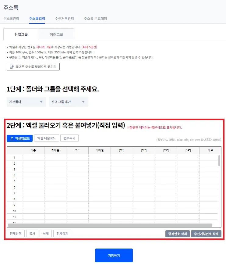 이름, 휴대폰번호, 메일 등 정보를 양식에 맞게 작성하셨다면 아래 [저장하기] 버튼만 누르면 주소록 입력의 모든 과정이 완료되는데요, 아래 이미지와 같이 양식에 맞지 않게 작성된 항목은 저장 시 자동으로 삭제되니 입력 시 주의가 필요합니다.