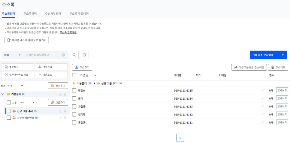 주소록 저장의 모든 과정이 완료되면 [주소록 > 주소록관리] 메뉴에서 해당되는 그룹을 클릭하시면 아래와 같이 입력한 이름, 번호 등 정보를 확인할 수 있습니다.