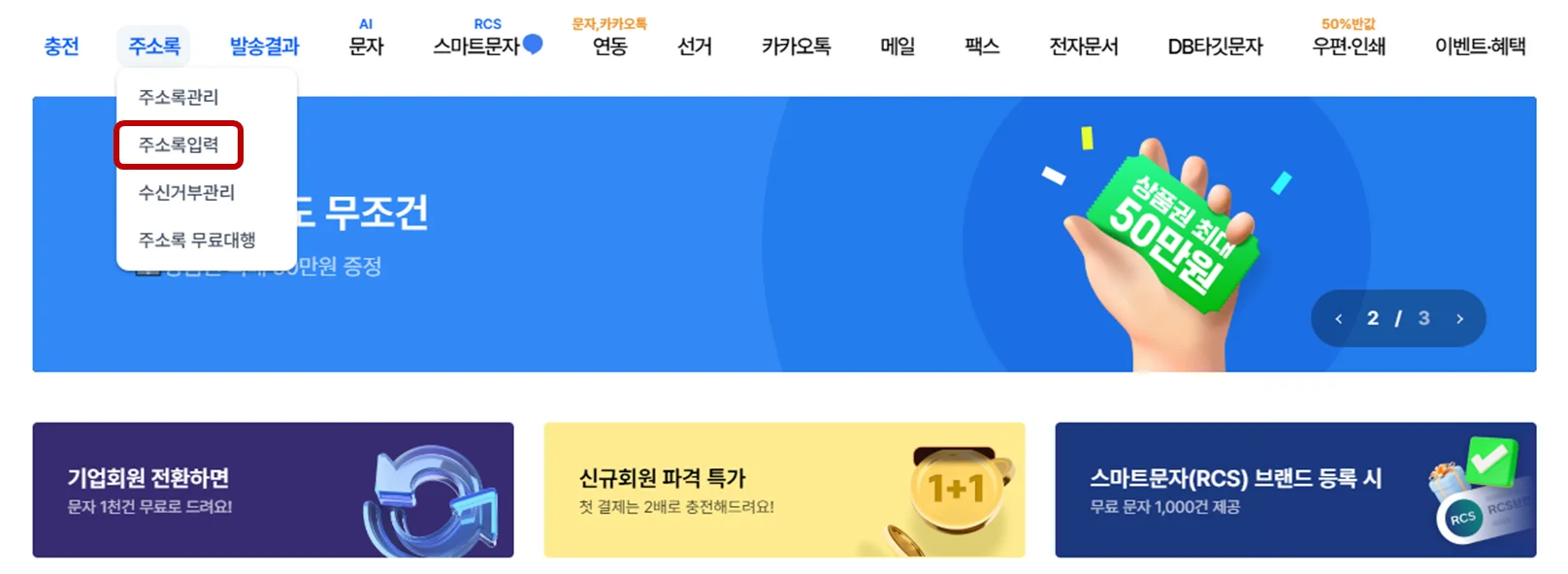 가장 먼저 뿌리오에 접속 후 상단 메뉴 중 [주소록 > 주소록입력] 메뉴를 클릭해주세요