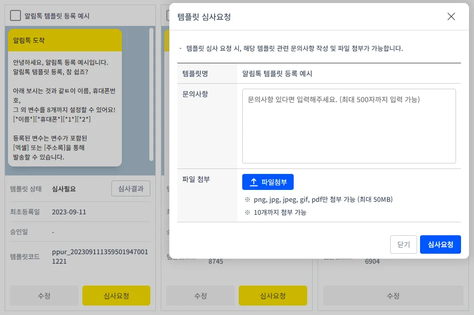템플릿 승인에는 약 2일~3일의 기간이 소요되므로 빠른 이용을 원하신다면 가입 즉시 템플릿을 등록 후 심사요청을 하도록 해야합니다.