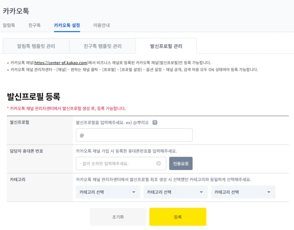 마지막으로 가입한 카카오톡 채널 아이디를 뿌리오에 등록합니다. 발신프로필, 휴대폰번호, 카테고리를 선택 후 [등록] 버튼을 클릭해주세요.