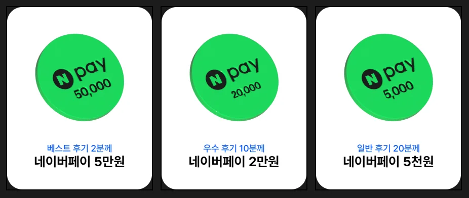 3) 네이버페이 지급: 이벤트에 참여해주신 분들을 대상으로 추첨을 통해 최대 5만원 네이버페이를 지급해드립니다. 소중한 후기도 남기고 포인트도 받을 수 있는 기회를 잡으세요!