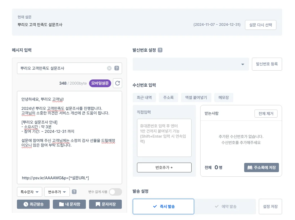 - 뿌리오 '모바일설문' 메뉴에서 메시지를 발송하실수 있으며, 메시지에 응답자별 고유 URL이 포함됩니다.