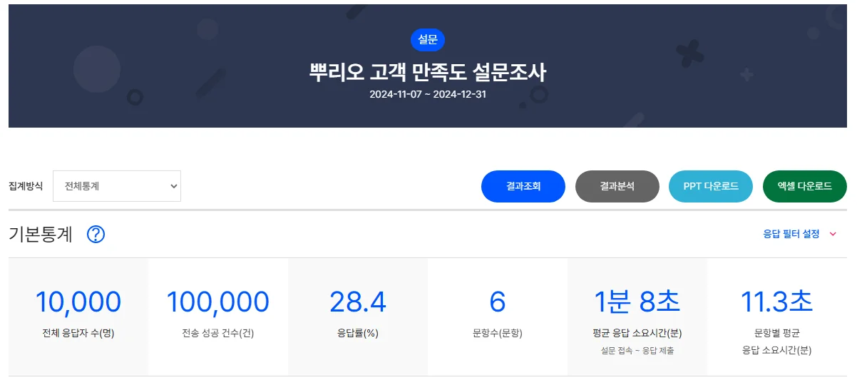 - 설문이 완료되면, 설문 결과 응답결과를 빠르게 확인하거나, 다양한 유형의 상세결과 다운로드(PPT, Excel)가 가능합니다.
