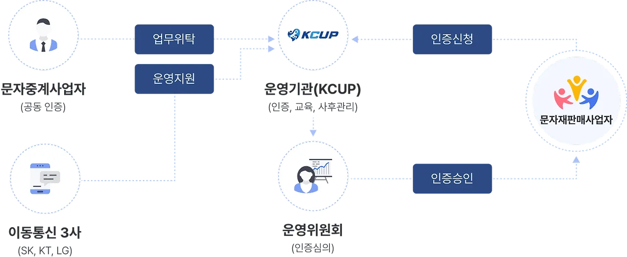 전송자격 인증은 문자중계사 통신사(KT, LGU+, SKB), 문자중계사(다우기술, 인포뱅크, CJ올리브네트웍스 등) 총 10개 사가 공동으로 인증을 하고 있어요.
