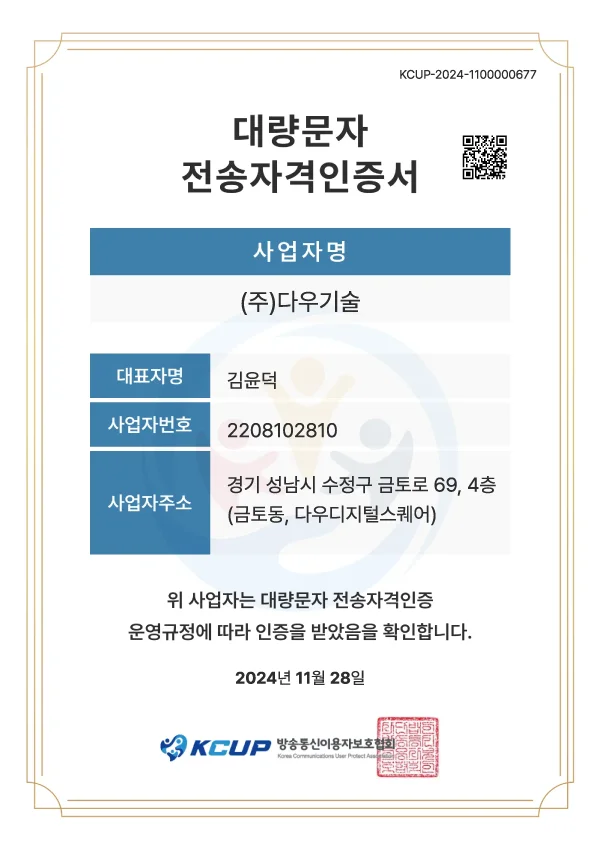 기존에 문자 발송업체를 이용해서 문자를 발송하고 계신다면, 전송자격인증제 인증을 받으셨는지 꼭 확인해 보세요.