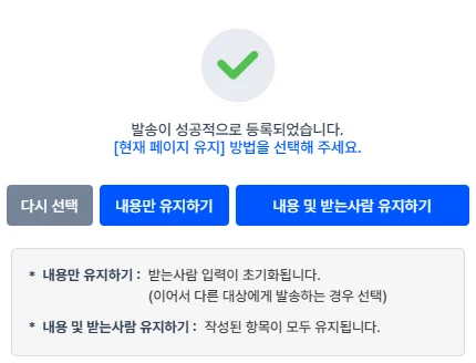 1. [새 메시지 작성] : 현재 페이지 (발송페이지)를 유지하며, 입력된 내용을 모두 초기화 합니다.