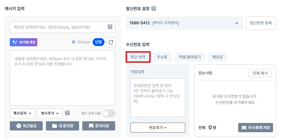 수신번호 입력의 [최근 내역] 기능을 통해 간단하게 대상를 불러올 수 있습니다.