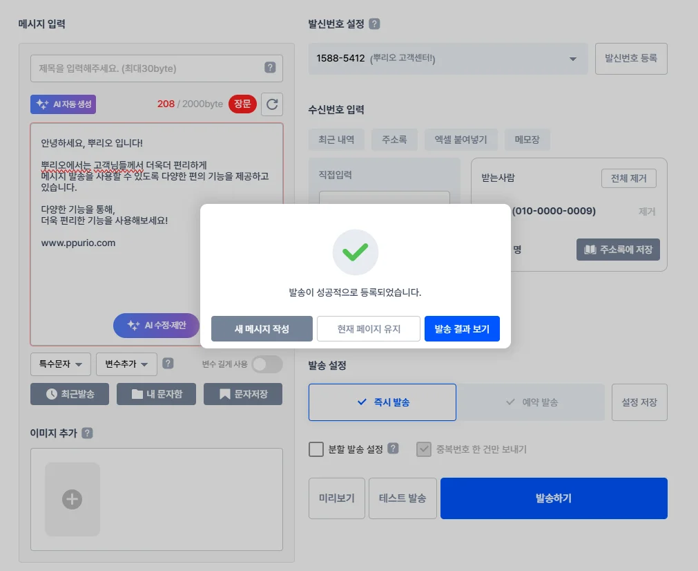 뿌리오에서 메시지를 발송하시게 되면, 아래와 같은 레이어를 확인하실 수 있습니다.