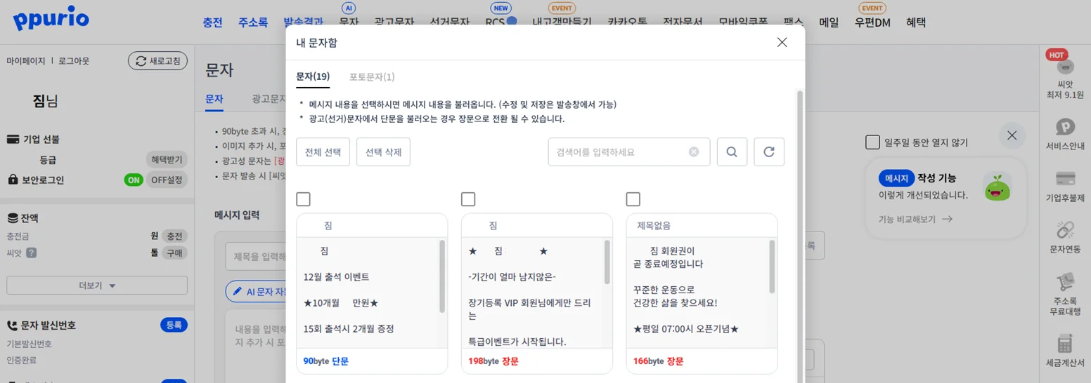A) 주로 이용하는 기능은 단체문자로 헬스장 이벤트나, 공지사항을 보내고 있어요. 특히나 예전에 보냈던 문구 또는 회원 주소 DB들이 기록에 남아있어 그 정보를 그대로 불러와 문자 내용만 간단히 수정후 바로 보낼 수 있다는게 장점이라고 생각해요. 그리고 문자전송에 대한 성공건과 실패건을 알 수 있어서 지출을 줄일 수 있다는 점도 좋았습니다.